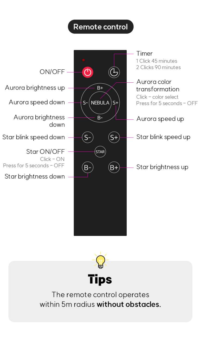 Options de contrôle faciles : contrôlez le projecteur via les boutons arrière ou la télécommande. Réglez les couleurs, la vitesse et la luminosité des nébuleuses et réglez les minuteries sur 45 ou 90 minutes pour un arrêt automatique, parfait pour s'endormir sous un ciel étoilé.