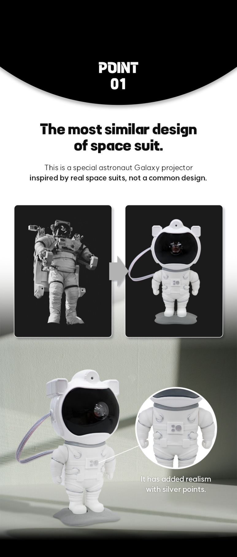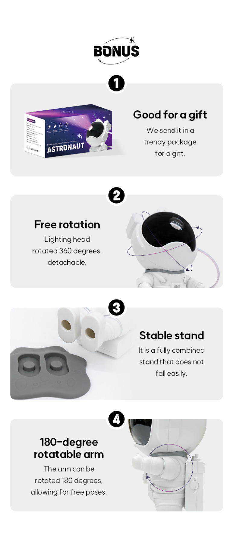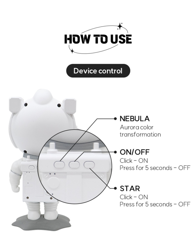 Conception innovante : doté d'un design d'astronaute unique avec un angle de projection de nébuleuse réglable à 360° et une base lunaire amovible, il sert également d'ornement décoratif ajoutant du charme à n'importe quel espace.