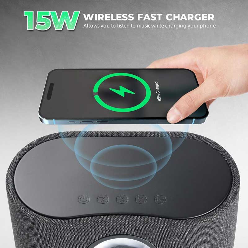 Convenient Wireless Charging: Embrace the convenience of wireless charging with the built-in 15W charging function. Simply place your phone on top of the speaker, and it charges effortlessly while you enjoy your music—no more tangled cables!