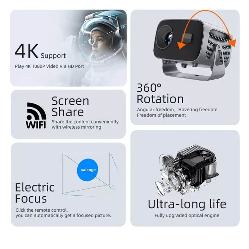 Equipped with WiFi 6 technology, this projector optimizes network connectivity, while also offering Bluetooth 5.2 functionality. Easily pair the projector with Bluetooth speakers, earphones, or AirPods for a seamless audio experience.