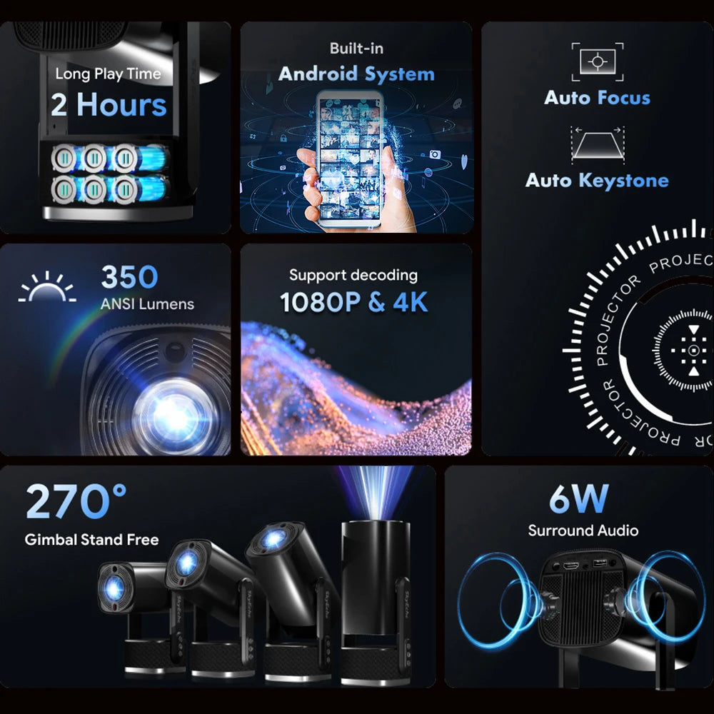 - Versatile Viewing Angles: The 270° rotating stand allows projection on walls, ceilings, or any surface, transforming your environment into a cinematic experience.